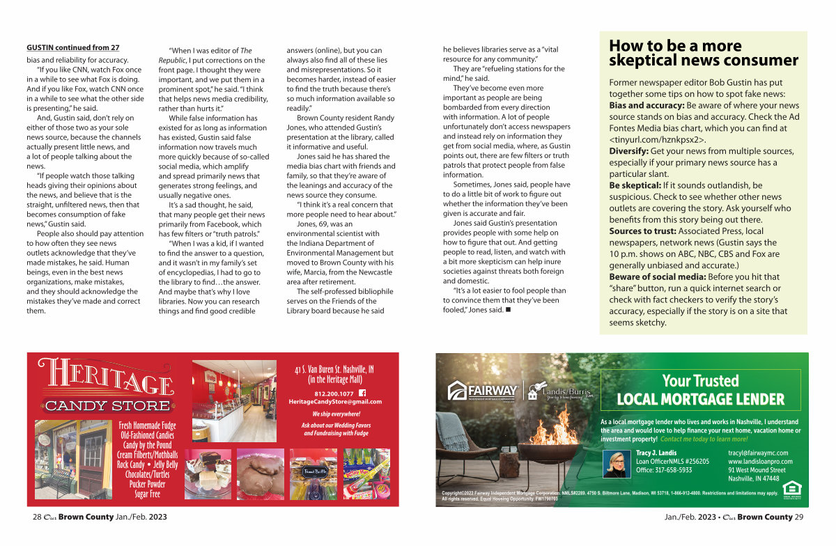 Former newspaper editor Bob Gustin has put together some tips on how to spot fake news: Bias and accuracy: Be aware of where your news source stands on bias and accuracy. Check the Ad Fontes Media bias chart, which you can find at < tinyurl. com / hznkpsx2 >. Diversify: Get your news from multiple sources, especially if your primary news source has a particular slant. Be skeptical: If it sounds outlandish, be suspicious. Check to see whether other news outlets are covering the story. Ask yourself who benefits from this story being out there. Sources to trust: Associated Press, local newspapers, network news( Gustin says the 10 p. m. shows on ABC, NBC, CBS and Fox are generally unbiased and accurate.) Beware of social media: Before you hit that“ share” button, run a quick internet search or check with fact checkers to verify the story’ s accuracy, especially if the story is on a site that seems sketchy.