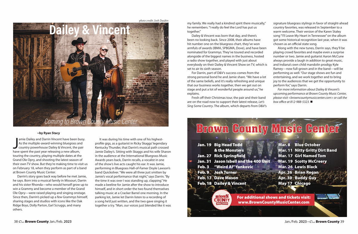 For more information about Dailey & Vincent’ s upcoming performance at Brown County Music Center, please visit < browncountymusiccenter. com > or call the box office at 812-988-5323. •