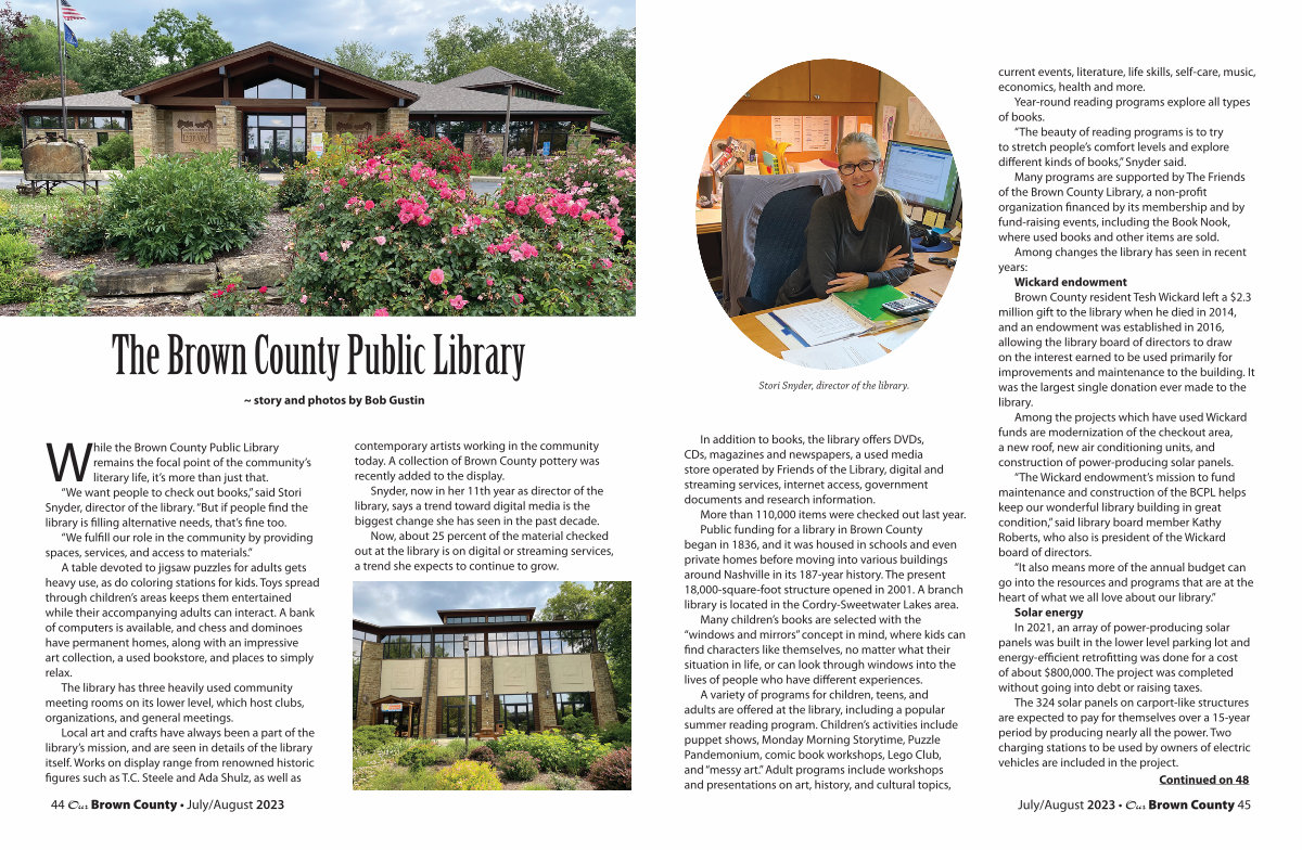 Public funding for a library in Brown County began in 1836, and it was housed in schools and even private homes before moving into various buildings around Nashville in its 187-year history. The present 18,000-square-foot structure opened in 2001. A branch library is located in the Cordry-Sweetwater Lakes area.