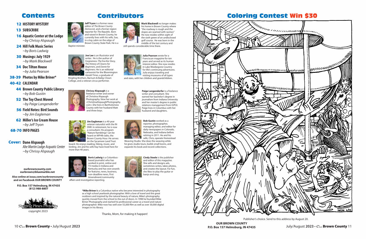 Cindy Steele is the publisher and editor of this magazine. She sells and designs ads, sometimes writes, takes photos, and creates the layout. For fun, she likes to play the guitar or banjo and sing.
