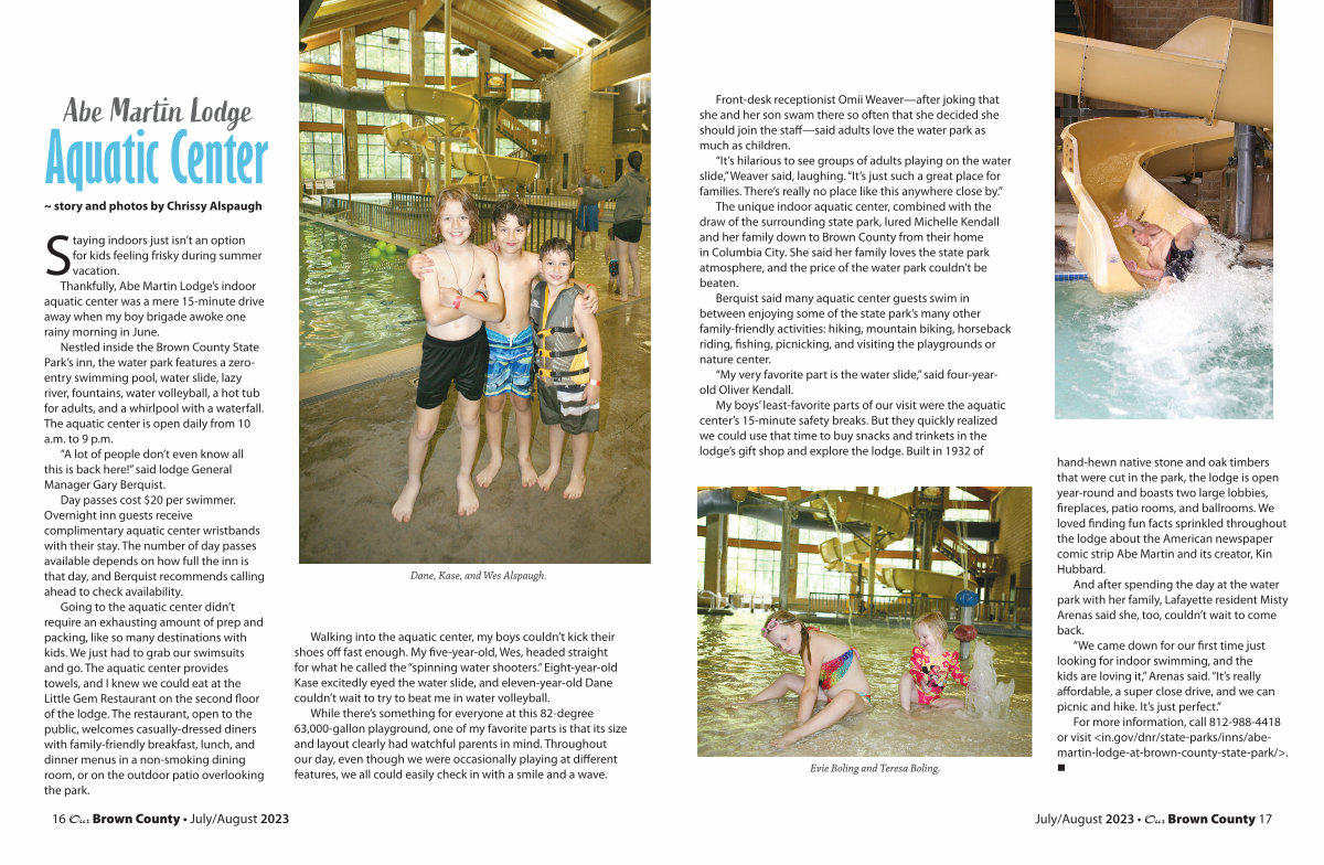 “ It’ s hilarious to see groups of adults playing on the water slide,” Weaver said, laughing.“ It’ s just such a great place for families. There’ s really no place like this anywhere close by.” The unique indoor aquatic center, combined with the draw of the surrounding state park, lured Michelle Kendall and her family down to Brown County from their home in Columbia City. She said her family loves the state park atmosphere, and the price of the water park couldn’ t be beaten.