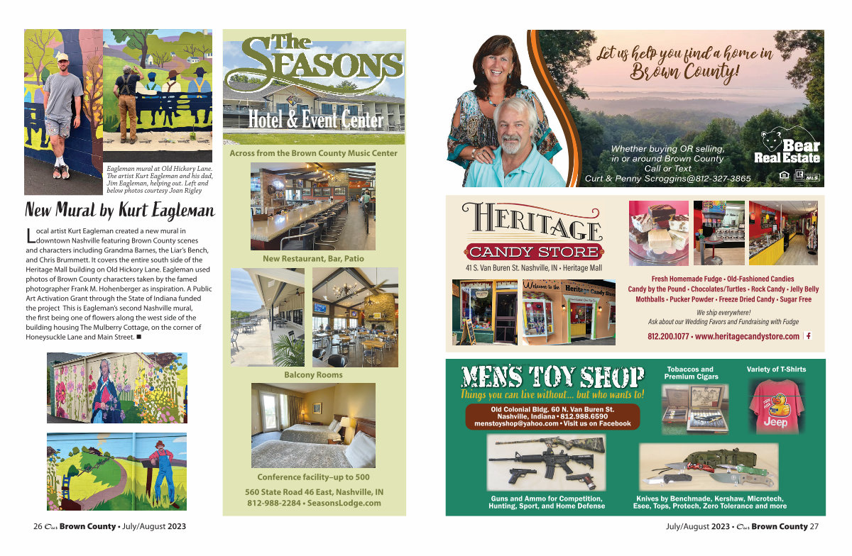 ocal artist Kurt Eagleman created a new mural in downtown Nashville featuring Brown County scenes and characters including Grandma Barnes, the Liar’ s Bench, and Chris Brummett. It covers the entire south side of the Heritage Mall building on Old Hickory Lane. Eagleman used photos of Brown County characters taken by the famed photographer Frank M. Hohenberger as inspiration. A Public Art Activation Grant through the State of Indiana funded the project This is Eagleman’ s second Nashville mural, the first being one of flowers along the west side of the building housing The Mulberry Cottage, on the corner of Honeysuckle Lane and Main Street. •