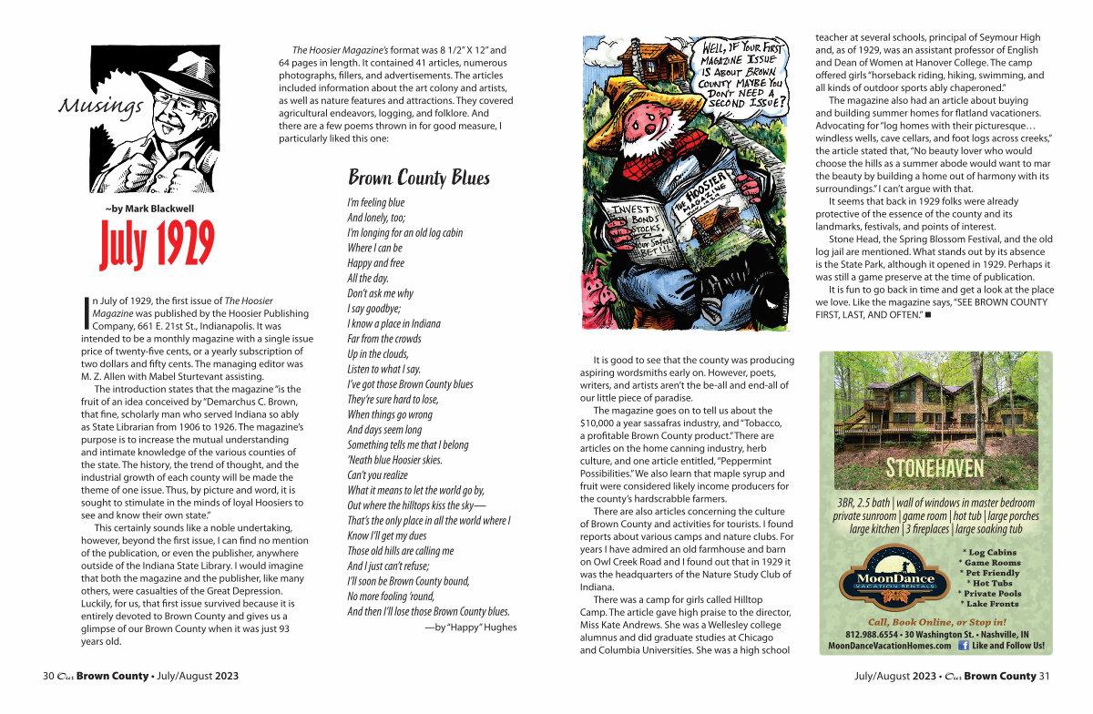 This certainly sounds like a noble undertaking, however, beyond the first issue, I can find no mention of the publication, or even the publisher, anywhere outside of the Indiana State Library. I would imagine that both the magazine and the publisher, like many others, were casualties of the Great Depression. Luckily, for us, that first issue survived because it is entirely devoted to Brown County and gives us a glimpse of our Brown County when it was just 93 years old.