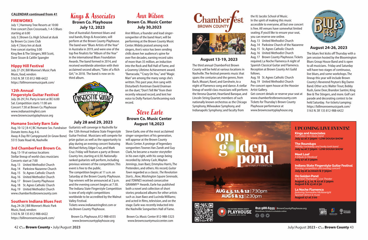 the IU Jacobs School of Music. In the spirit of making this music accessible to everyone, all but one concert is free. All venues have somewhat limited seating. If you’ d like to ensure your seat, you can reserve one online. Aug. 13 United Methodist Church Aug. 14 Parkview Church of the Nazarene Aug. 15 St. Agnes Catholic Church Aug. 16 United Methodist Church Aug. 17 Brown County Playhouse. Tickets required. La Noche Flamenca A night of Spanish Classical Guitar and Flamenco. Reception at Brown County Art Guild follows. Aug. 18 St. Agnes Catholic Church Aug. 19 United Methodist Church Pre-concert open house at the Hoosier Artist Gallery. Get concert details or reserve your seat at www. chamberfestbrowncounty. com Tickets for Thursday’ s Brown County Playhouse performance at www. browncountyplayhouse. org