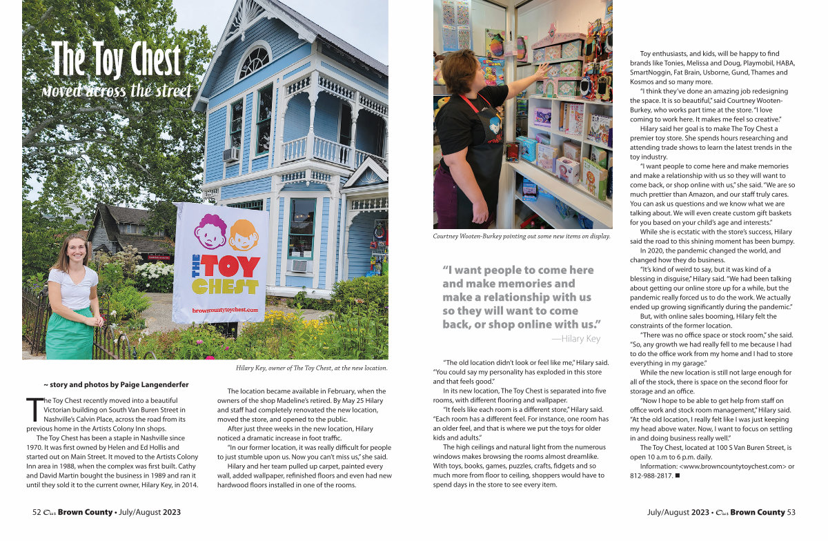 The Toy Chest has been a staple in Nashville since 1970. It was first owned by Helen and Ed Hollis and started out on Main Street. It moved to the Artists Colony Inn area in 1988, when the complex was first built. Cathy and David Martin bought the business in 1989 and ran it until they sold it to the current owner, Hilary Key, in 2014.