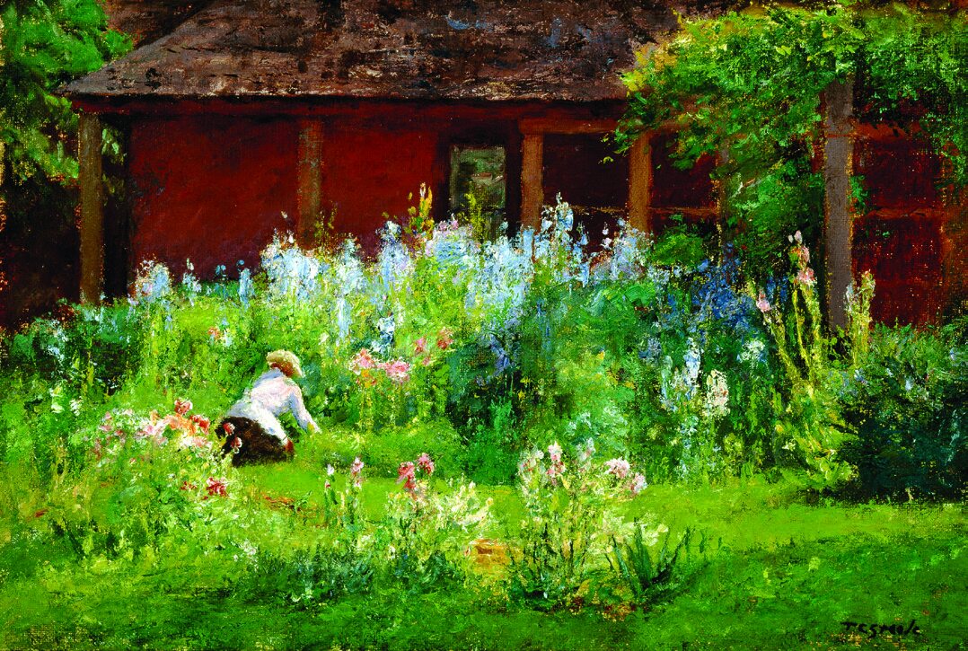 Passionate for landscaping and gardening, Selma secured wagonloads of manure and leaf litter to build the soil. Agricultural bulletins given to neighbors were used as fire starters or padding for their rag rugs. The formal garden and hillsides of daffodils inspired Theodore to paint garden and floral subjects.
