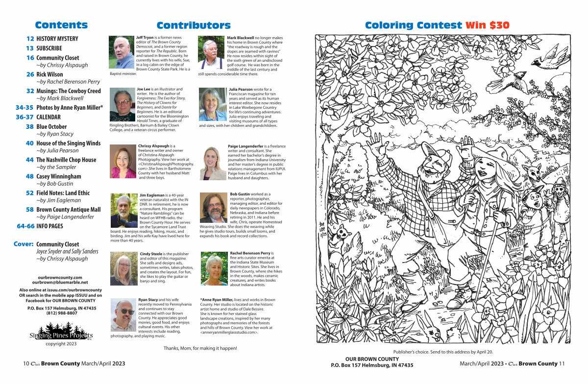 Cindy Steele is the publisher and editor of this magazine. She sells and designs ads, sometimes writes, takes photos, and creates the layout. For fun, she likes to play the guitar or banjo and sing.