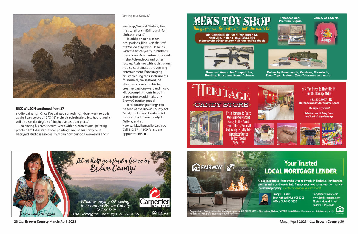 Rick Wilson’ s paintings can be seen at the Brown County Art Guild, the Indiana Heritage Art room at the Brown County Art Gallery, and at < www. rickwilsongallery. com >. Call 812-371-1699 for studio appointments. •