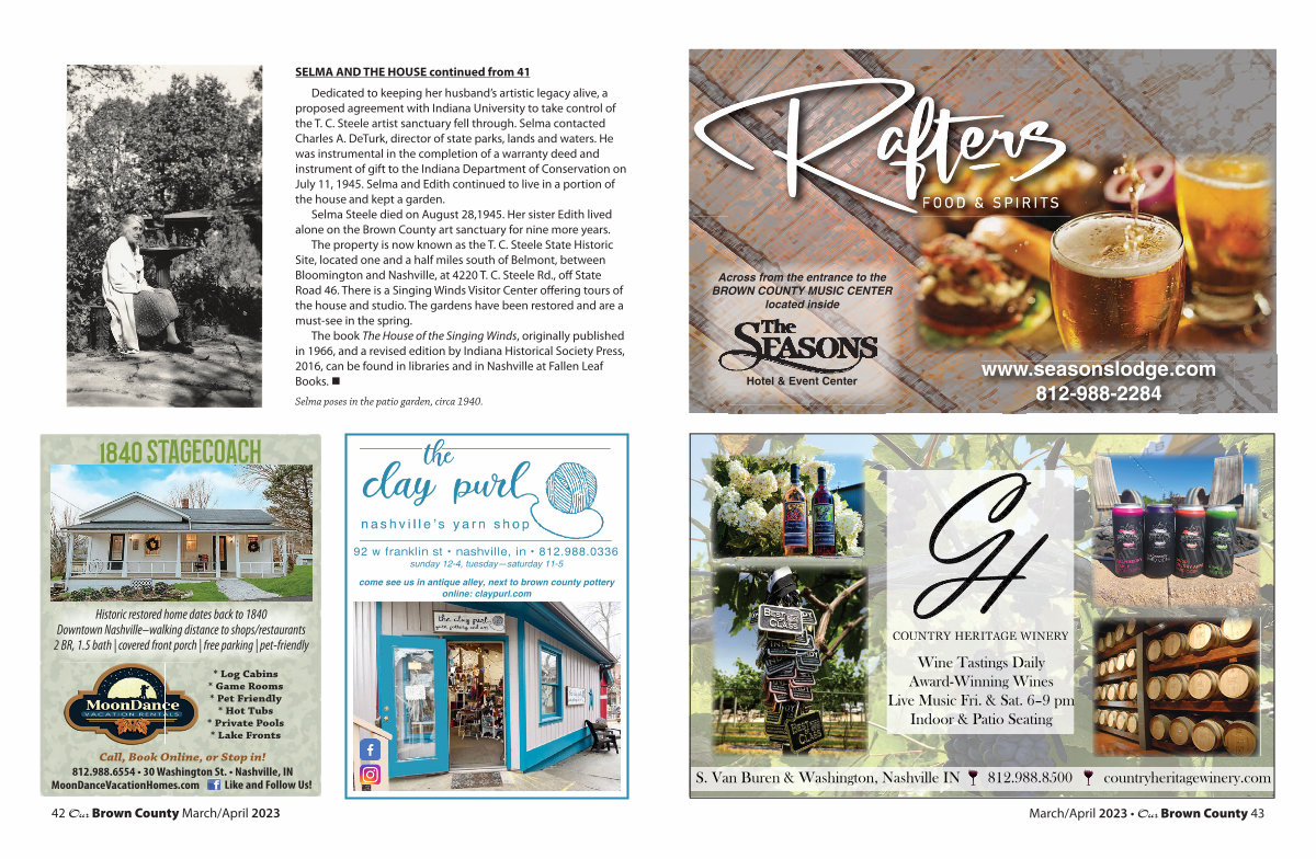 The book The House of the Singing Winds, originally published in 1966, and a revised edition by Indiana Historical Society Press, 2016, can be found in libraries and in Nashville at Fallen Leaf Books. •