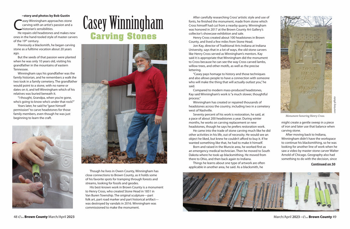 After carefully researching Cross’ artistic style and use of fonts, he finished the monument, made from stone which Cross himself had cut from a nearby quarry. Winningham was honored in 2017 at the Brown County Art Gallery’ s collector’ s showcase exhibition and sale.