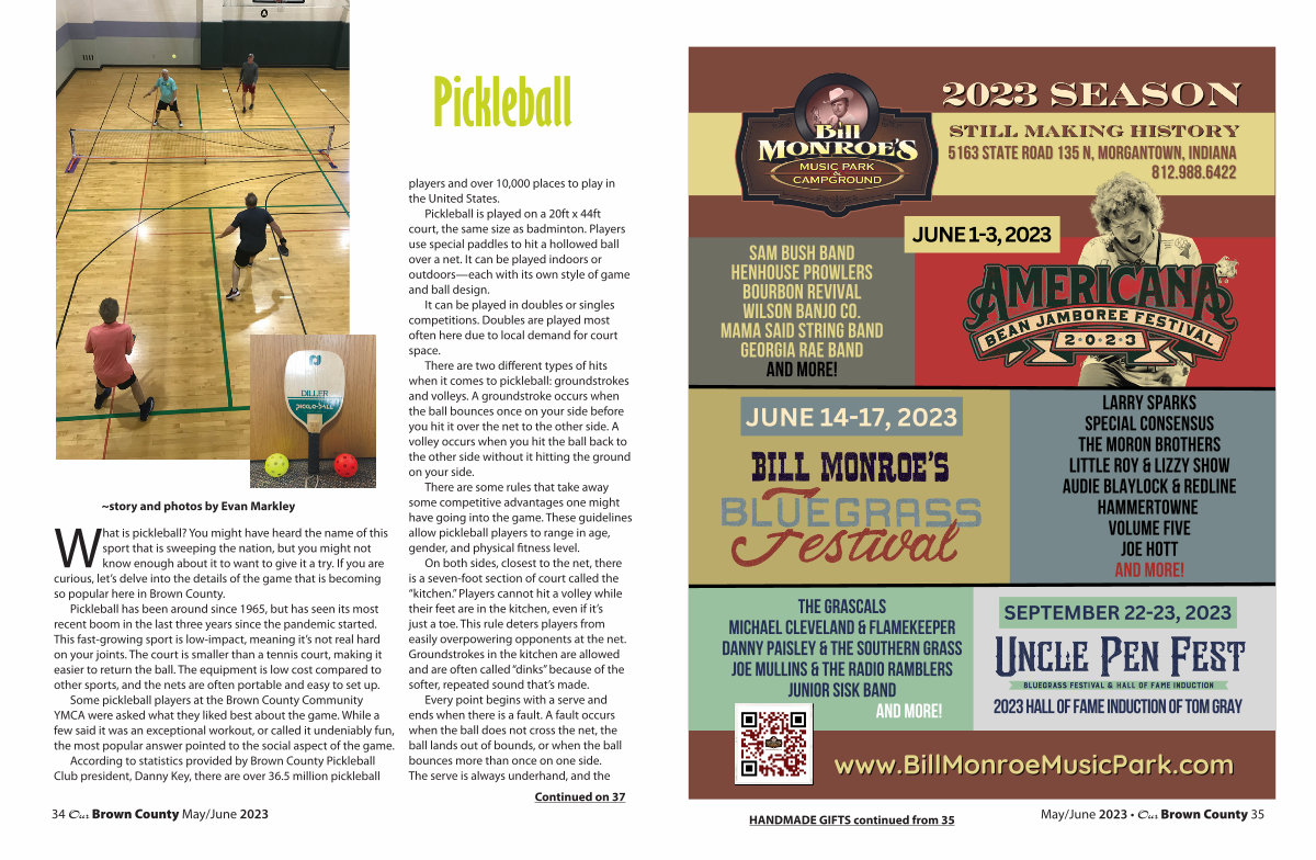 Pickleball has a bright future in Brown County. A recent story in the Brown County Democrat explained that Brown County Parks and Recreation has granted conditional approval for new pickleball courts to be built at Deer Run Park, on the west side of Nashville. This site would be funded by donors and grant money allocated by the Brown County Pickleball Club. The Department of Natural Resources (DNR) must approve the project before construction can begin because the park is in a designated flood zone. The proposal includes the creation of six courts.