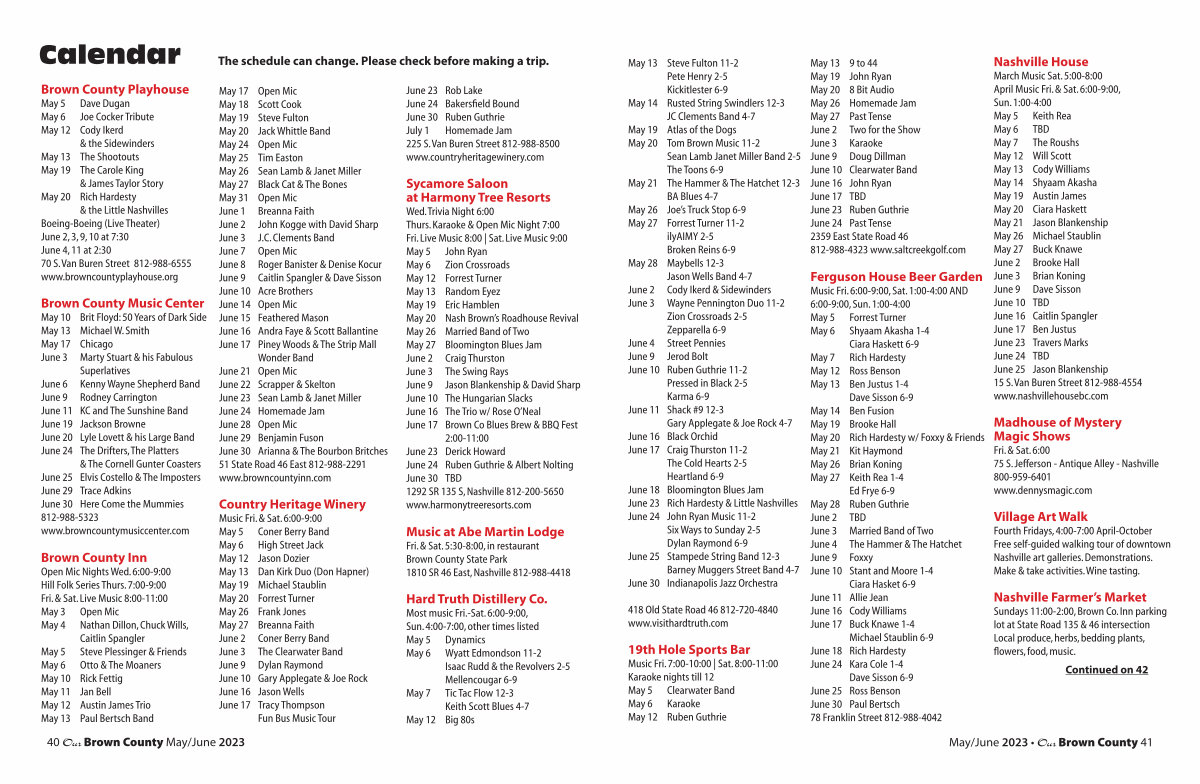 March Music Sat. 5:00-8:00 April Music Fri. & Sat. 6:00-9:00, Sun. 1:00-4:00 May 5 Keith Rea May 6 TBD May 7 The Roushs May 12 Will Scott May 13 Cody Williams May 14 Shyaam Akasha May 19 Austin James May 20 Ciara Haskett May 21 Jason Blankenship May 26 Michael Staublin May 27 Buck Knawe June 2 Brooke Hall June 3 Brian Koning June 9 Dave Sisson June 10 TBD June 16 Caitlin Spangler June 17 Ben Justus June 23 Travers Marks June 24 TBD June 25 Jason Blankenship 15 S. Van Buren Street 812-988-4554 www. nashvillehousebc. com