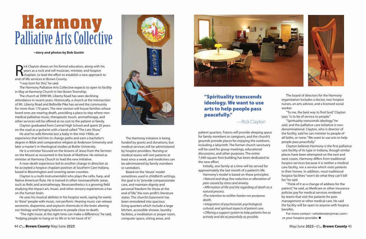 Rick Clayton draws on his formal education, along with his years as a rock and roll musician, minister, and hospice chaplain, to lead the effort to establish a new approach to end-of-life services in Brown County.“ I was born for this,” he said. The Harmony Palliative Arts Collective expects to open its facility in May at Harmony Church in Van Buren Township.