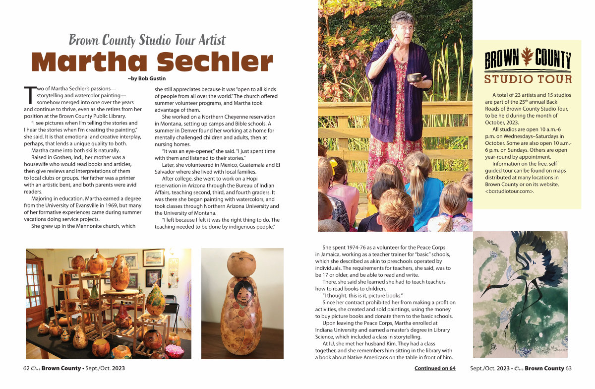 Another part of Martha’s creative life is in her artwork. Her Lightspinner Studio in the Helmsburg area has been part of the annual October Back Roads of Brown County Studio Tour for 10 years. Her creations include watercolor scenes and artwork on gourds (no, she quickly adds, her gourds aren’t meant to be birdhouses).