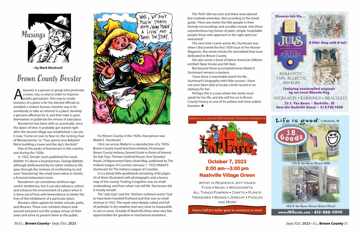Perhaps this is a case where her works must speak for her life, and she will live on in Brown County history as one of its earliest and most ardent boosters. •