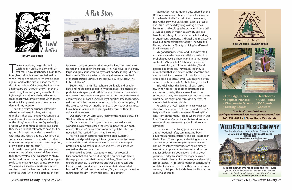 More recently, Free Fishing Days offered by the DNR, gave us a great chance to get a fishing pole in the hands of kids for their first time— adults, too. At the Brown County State Park’ s lakes Ogle and Strahl, we held day-long casting demos, bait-tying, and ecology talks. A shelter house grill provided a taste of freshly caught bluegill and bass. Local fishing clubs promoted safe handling of equipment, etiquette, and catch and release. We gave out bumper stickers stating,“ The Quality of Fishing reflects the Quality of Living,” and“ We all Live Downstream.”