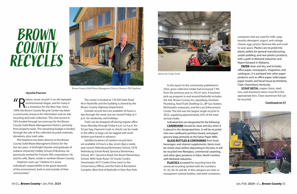 For more information about recycling in Brown County, special event dates in 2024, and the Adopta-Road Program, call the Brown County Recycle Center at 812-988-0140, and bookmark their website: <browncountyrecycles.org>.
