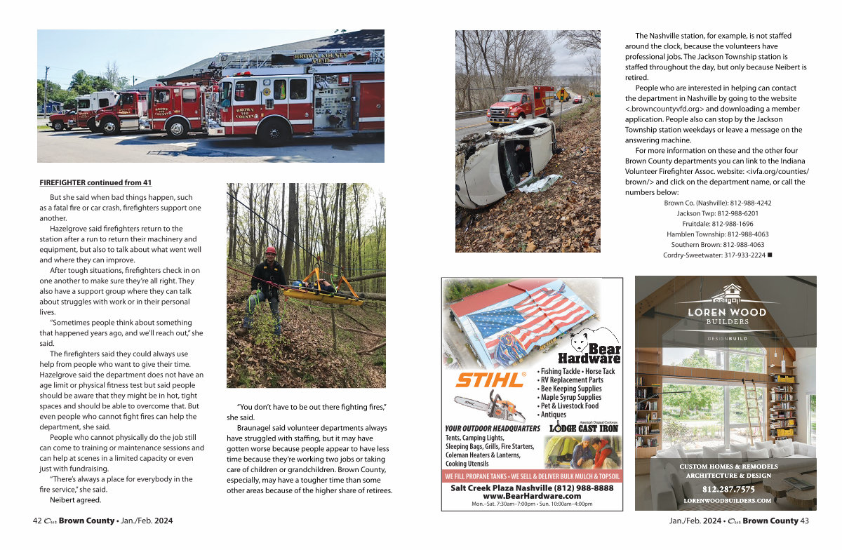 Braunagel said volunteer departments always have struggled with staffing, but it may have gotten worse because people appear to have less time because they’ re working two jobs or taking care of children or grandchildren. Brown County, especially, may have a tougher time than some other areas because of the higher share of retirees.