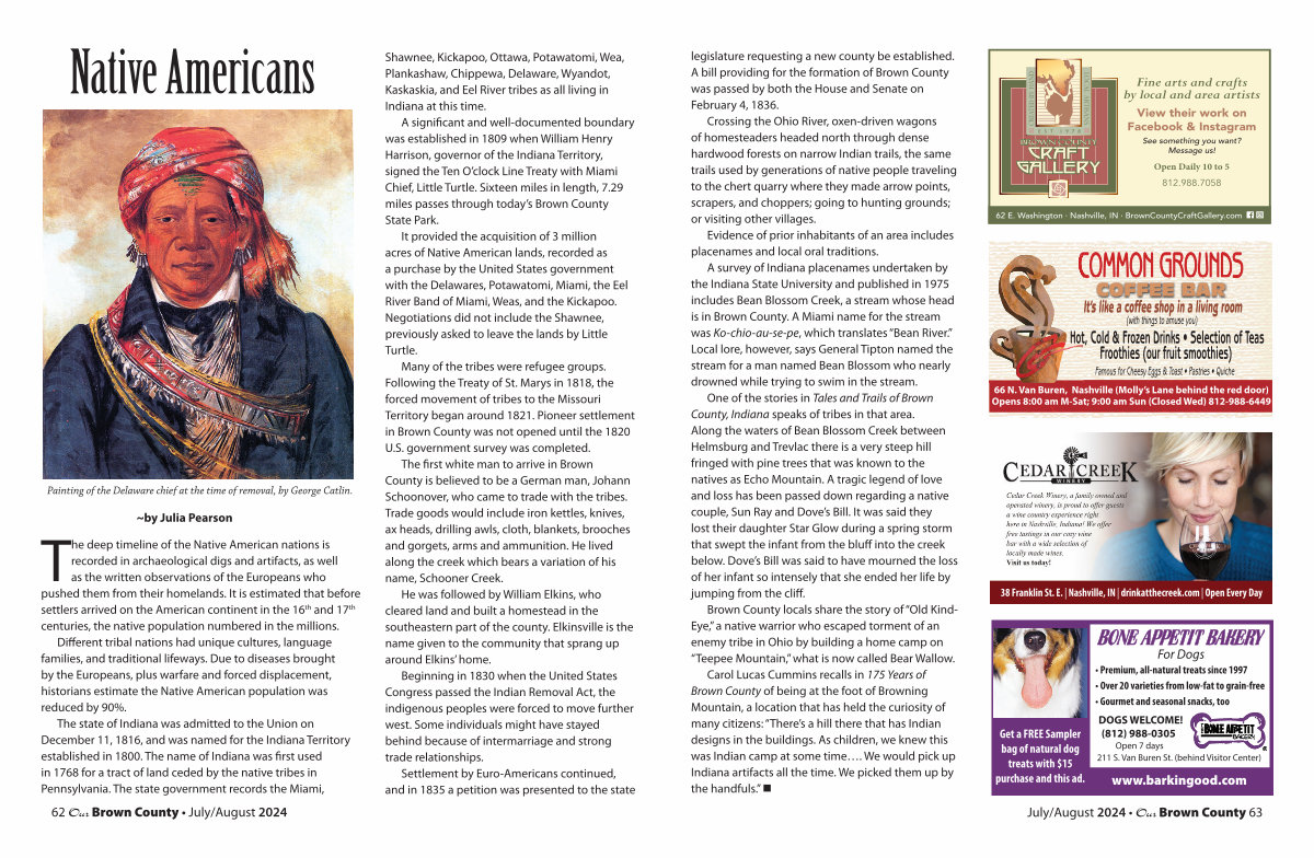 Carol Lucas Cummins recalls in 175 Years of Brown County of being at the foot of Browning Mountain, a location that has held the curiosity of many citizens: “There’s a hill there that has Indian designs in the buildings. As children, we knew this was Indian camp at some time…. We would pick up Indiana artifacts all the time. We picked them up by the handfuls.”