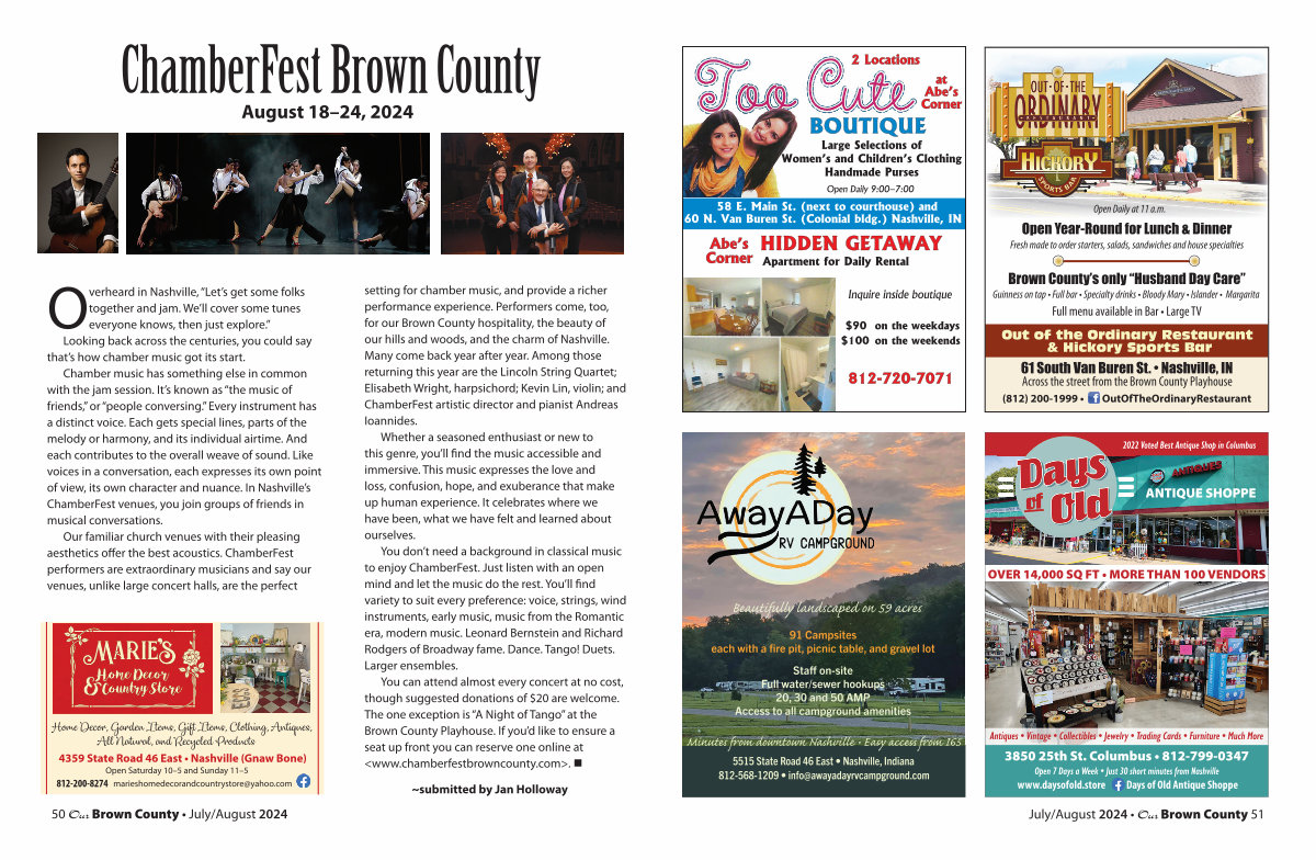 50 Our Brown County • July / August 2024 setting for chamber music, and provide a richer performance experience. Performers come, too, for our Brown County hospitality, the beauty of our hills and woods, and the charm of Nashville. Many come back year after year. Among those returning this year are the Lincoln String Quartet; Elisabeth Wright, harpsichord; Kevin Lin, violin; and ChamberFest artistic director and pianist Andreas Ioannides.