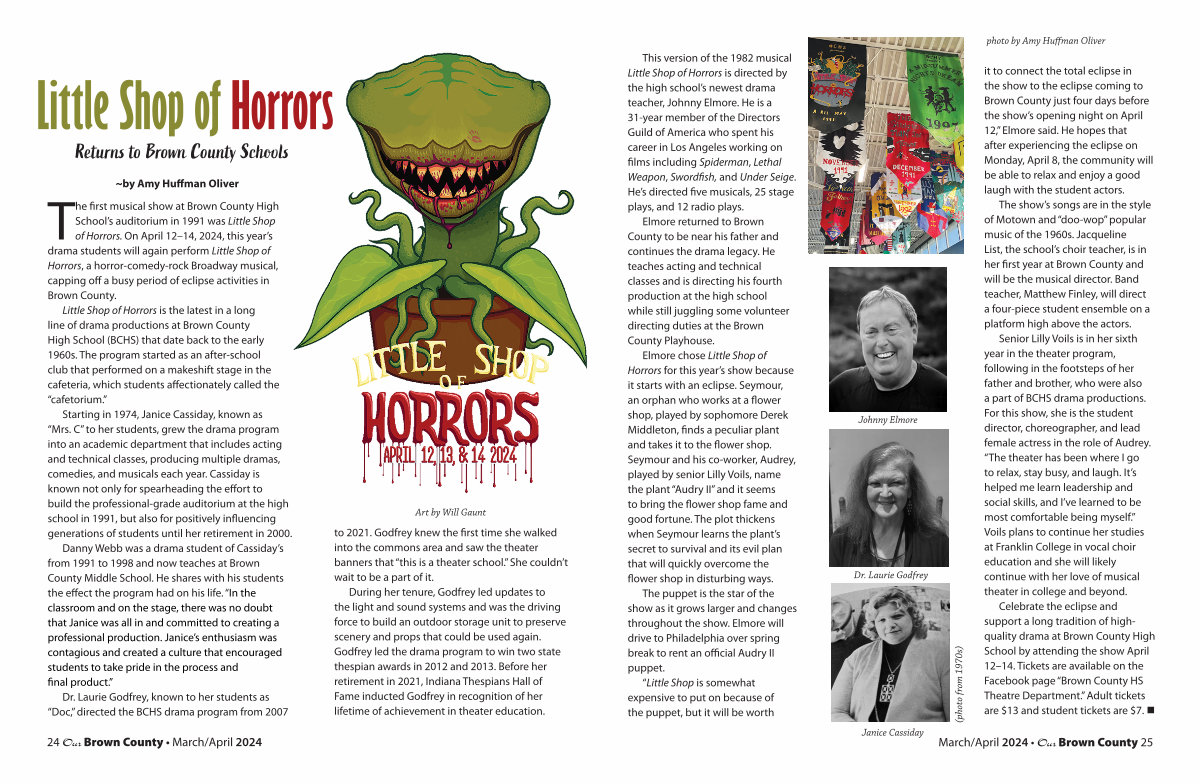 Senior Lilly Voils is in her sixth year in the theater program, following in the footsteps of her father and brother, who were also a part of BCHS drama productions. For this show, she is the student director, choreographer, and lead female actress in the role of Audrey.“ The theater has been where I go to relax, stay busy, and laugh. It’ s helped me learn leadership and social skills, and I’ ve learned to be most comfortable being myself.” Voils plans to continue her studies at Franklin College in vocal choir education and she will likely continue with her love of musical theater in college and beyond. Celebrate the eclipse and support a long tradition of highquality drama at Brown County High School by attending the show April 12 – 14. Tickets are available on the Facebook page“ Brown County HS Theatre Department.” Adult tickets are $ 13 and student tickets are $ 7. •