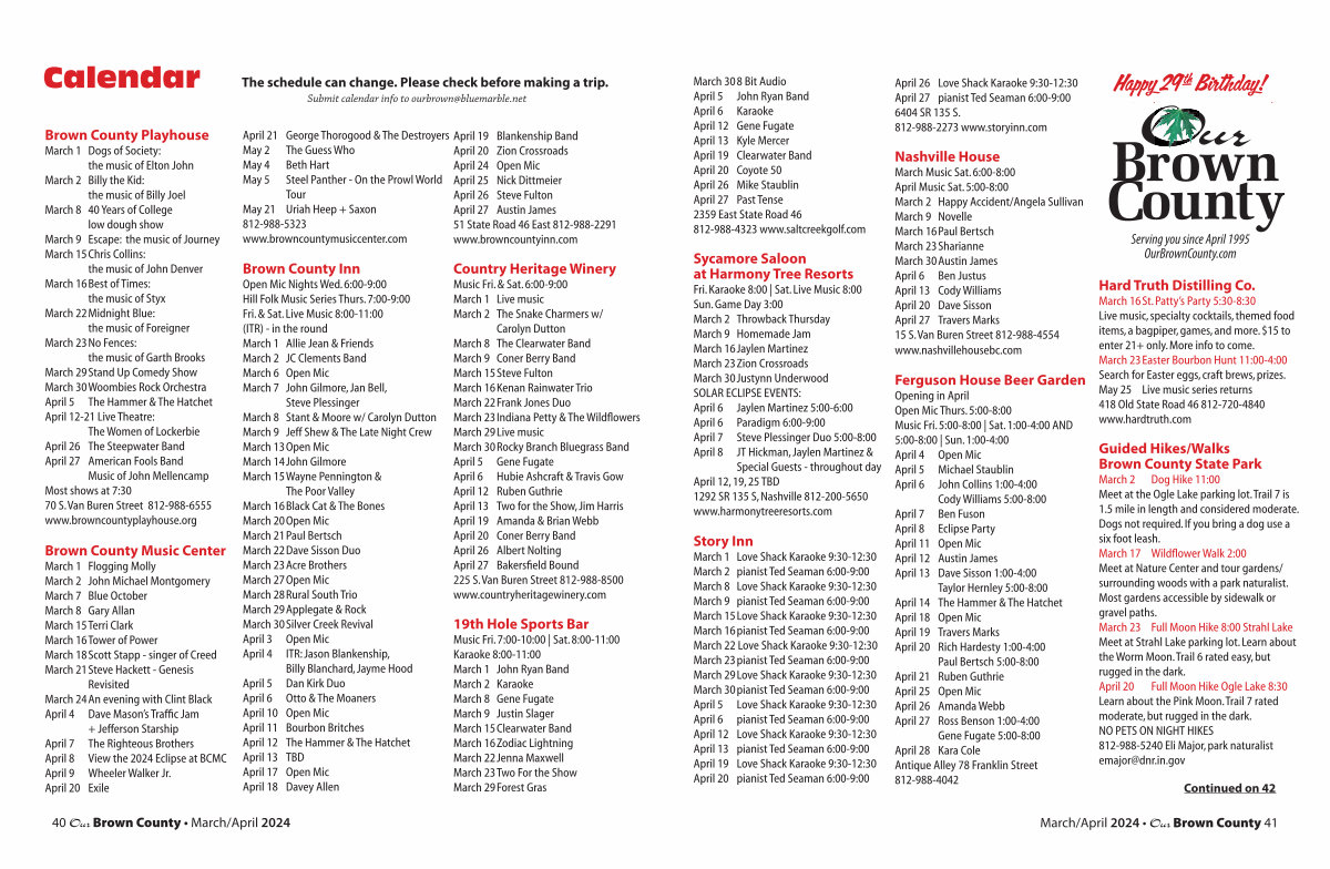Carolyn Dutton March 8 The Clearwater Band March 9 Coner Berry Band March 15 Steve Fulton March 16 Kenan Rainwater Trio March 22 Frank Jones Duo March 23 Indiana Petty & The Wildflowers March 29 Live music March 30 Rocky Branch Bluegrass Band April 5 Gene Fugate April 6 Hubie Ashcraft & Travis Gow April 12 Ruben Guthrie April 13 Two for the Show, Jim Harris April 19 Amanda & Brian Webb April 20 Coner Berry Band April 26 Albert Nolting April 27 Bakersfield Bound 225 S. Van Buren Street 812-988-8500 www. countryheritagewinery. com