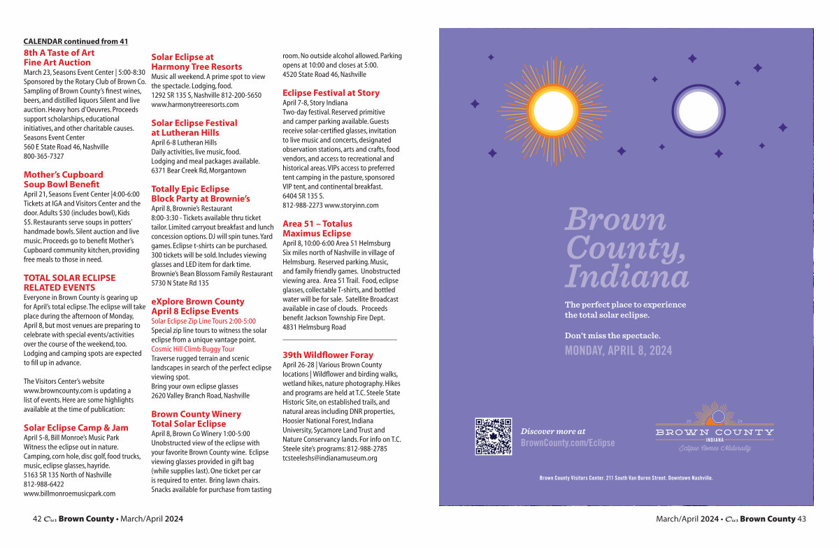 Everyone in Brown County is gearing up for April’ s total eclipse. The eclipse will take place during the afternoon of Monday, April 8, but most venues are preparing to celebrate with special events / activities over the course of the weekend, too. Lodging and camping spots are expected to fill up in advance.