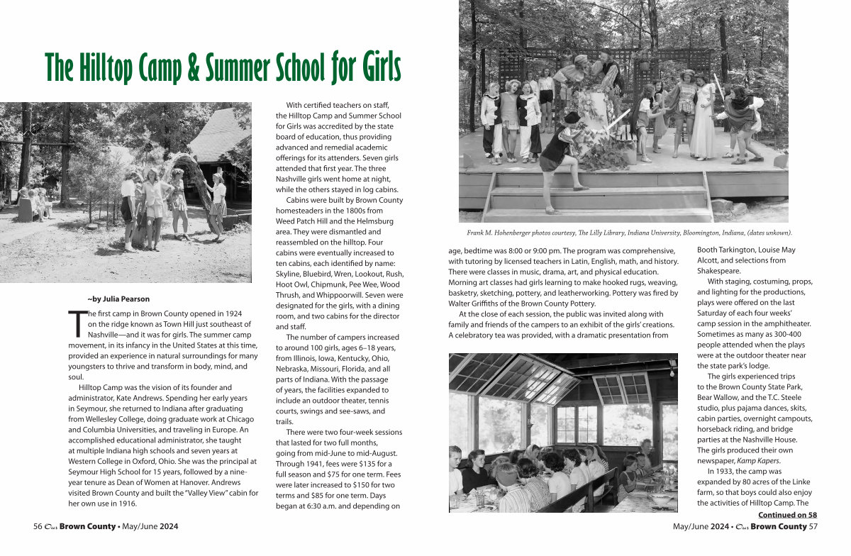 Hilltop Camp was the vision of its founder and administrator, Kate Andrews. Spending her early years in Seymour, she returned to Indiana after graduating from Wellesley College, doing graduate work at Chicago and Columbia Universities, and traveling in Europe. An accomplished educational administrator, she taught at multiple Indiana high schools and seven years at Western College in Oxford, Ohio. She was the principal at Seymour High School for 15 years, followed by a nineyear tenure as Dean of Women at Hanover. Andrews visited Brown County and built the “Valley View” cabin for her own use in 1916.