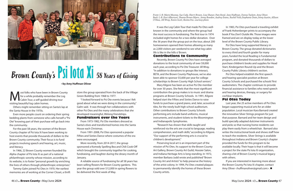 Recently, Brown County Psi Otes have averaged donations to the local community of over $9,000 each year, according to Psi Ote Treasurer Jill Wray. “In addition to donations to groups like Interact, BETA, and the Brown County Playhouse, we’ve also been able to sponsor $5,600 per year for college scholarships to Brown County High School seniors.”