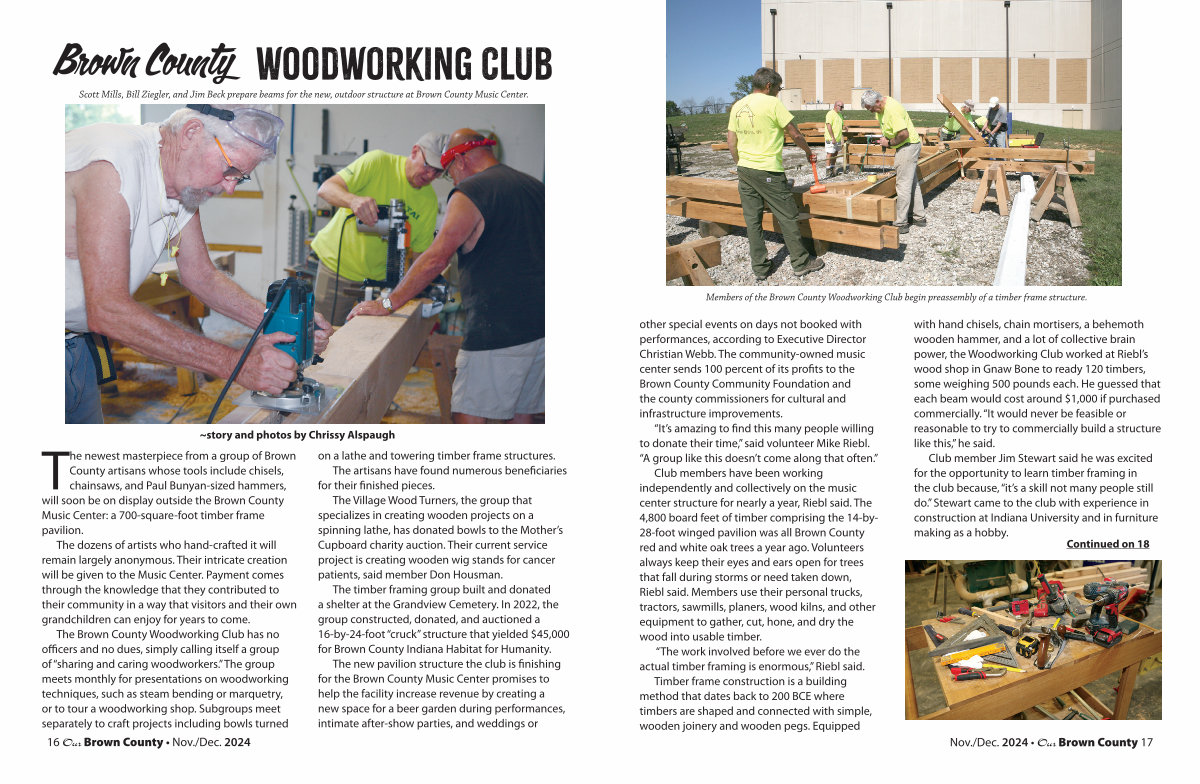 Club members have been working independently and collectively on the music center structure for nearly a year, Riebl said. The 4,800 board feet of timber comprising the 14-by- 28-foot winged pavilion was all Brown County red and white oak trees a year ago. Volunteers always keep their eyes and ears open for trees that fall during storms or need taken down, Riebl said. Members use their personal trucks, tractors, sawmills, planers, wood kilns, and other equipment to gather, cut, hone, and dry the wood into usable timber.