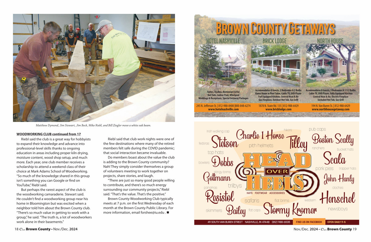 Brown County Woodworking Club typically meets at 7 p. m. on the first Wednesday of each month at the Brown County Public Library. For more information, email forshee @ iu. edu. •
