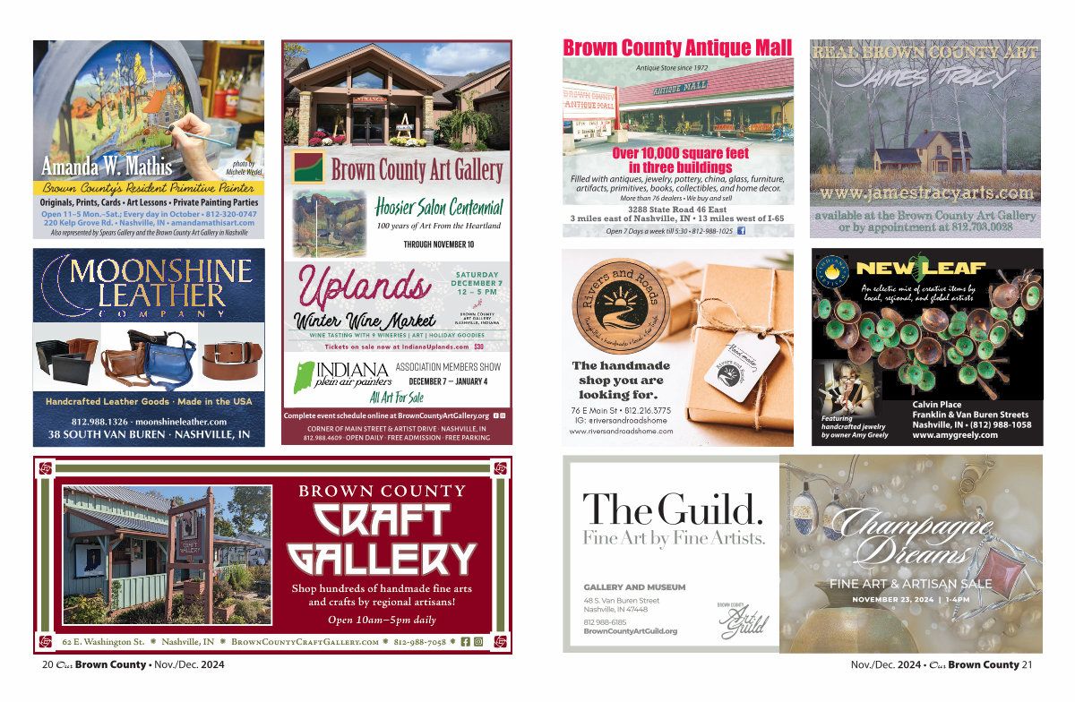 Open 11 – 5 Mon.– Sat.; Every day in October • 812-320-0747 220 Kelp Grove Rd. • Nashville, IN • amandamathisart. com Also represented by Spears Gallery and the Brown County Art Gallery in Nashville