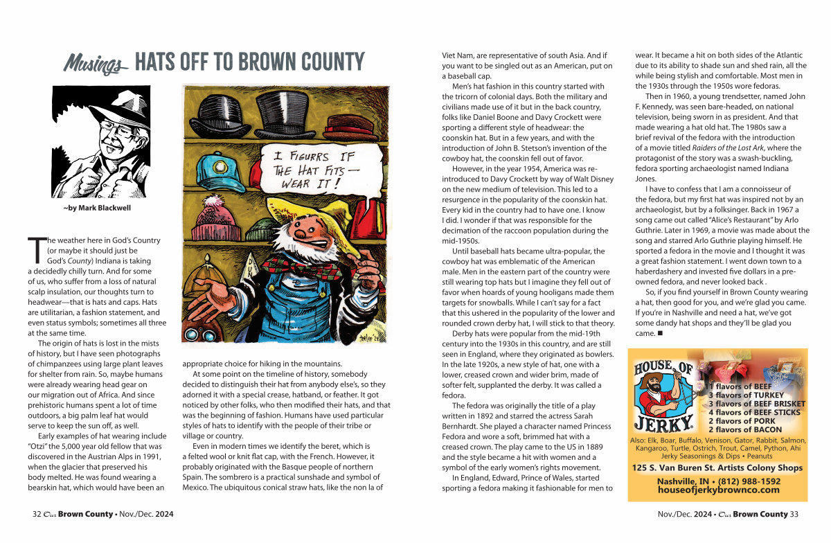 So, if you find yourself in Brown County wearing a hat, then good for you, and we’ re glad you came. If you’ re in Nashville and need a hat, we’ ve got some dandy hat shops and they’ ll be glad you came. •