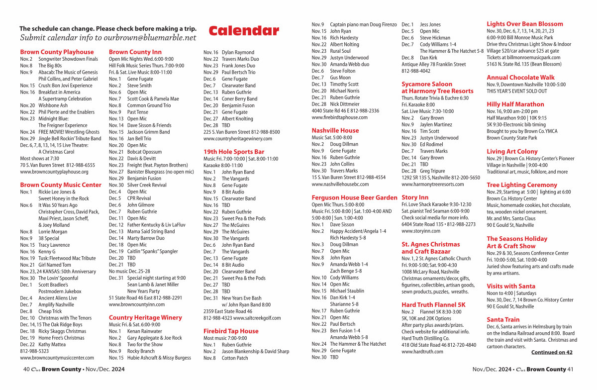Open Mic Nights Wed. 6:00-9:00 Hill Folk Music Series Thurs. 7:00-9:00 Fri. & Sat. Live Music 8:00-11:00 Nov. 1 Gene Fugate Nov. 2 Steve Smith Nov. 6 Open Mic Nov. 7 Scott Cook & Pamela Mae Nov. 8 Common Ground Trio Nov. 9 Past Tense Nov. 13 Open Mic Nov. 14 Dave Sisson & Friends Nov. 15 Jackson Grimm Band Nov. 16 Jan Bell Trio Nov. 20 Open Mic Nov. 21 Bobcat Opossum Nov. 22 Davis & Devitt Nov. 23 Freight( feat. Payton Brothers) Nov. 27 Banister Bluegrass( no open mic) Nov. 29 Benjamin Fusion Nov. 30 Silver Creek Revival Dec. 4 Open Mic Dec. 5 CPR Revival Dec. 6 John Gilmore Dec. 7 Ruben Guthrie Dec. 11 Open Mic Dec. 12 Father Kentucky & Liv LaFluv Dec. 13 Mama Said String Band Dec. 14 Marty Barrow Duo Dec. 18 Open Mic Dec. 19 Caitlin“ Spanks” Spangler Dec. 20 TBD Dec. 21 TBD No music Dec. 25-28 Dec. 31 Special night starting at 9:00 Sean Lamb & Janet Miller New Years Party 51 State Road 46 East 812-988-2291 www. browncountyinn. com