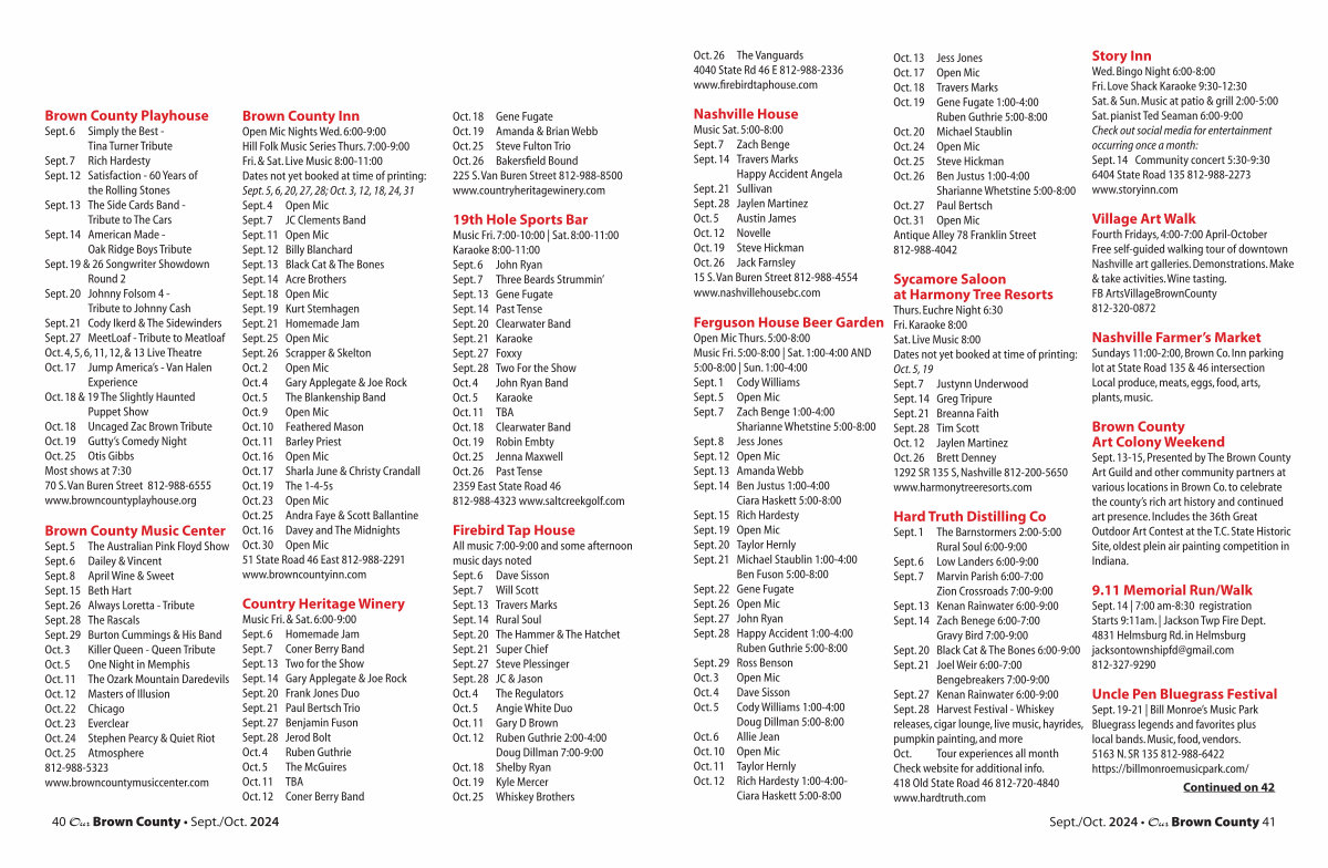 Thurs. Euchre Night 6:30 Fri. Karaoke 8:00 Sat. Live Music 8:00 Dates not yet booked at time of printing: Oct. 5, 19 Sept. 7 Justynn Underwood Sept. 14 Greg Tripure Sept. 21 Breanna Faith Sept. 28 Tim Scott Oct. 12 Jaylen Martinez Oct. 26 Brett Denney 1292 SR 135 S, Nashville 812-200-5650 www. harmonytreeresorts. com
