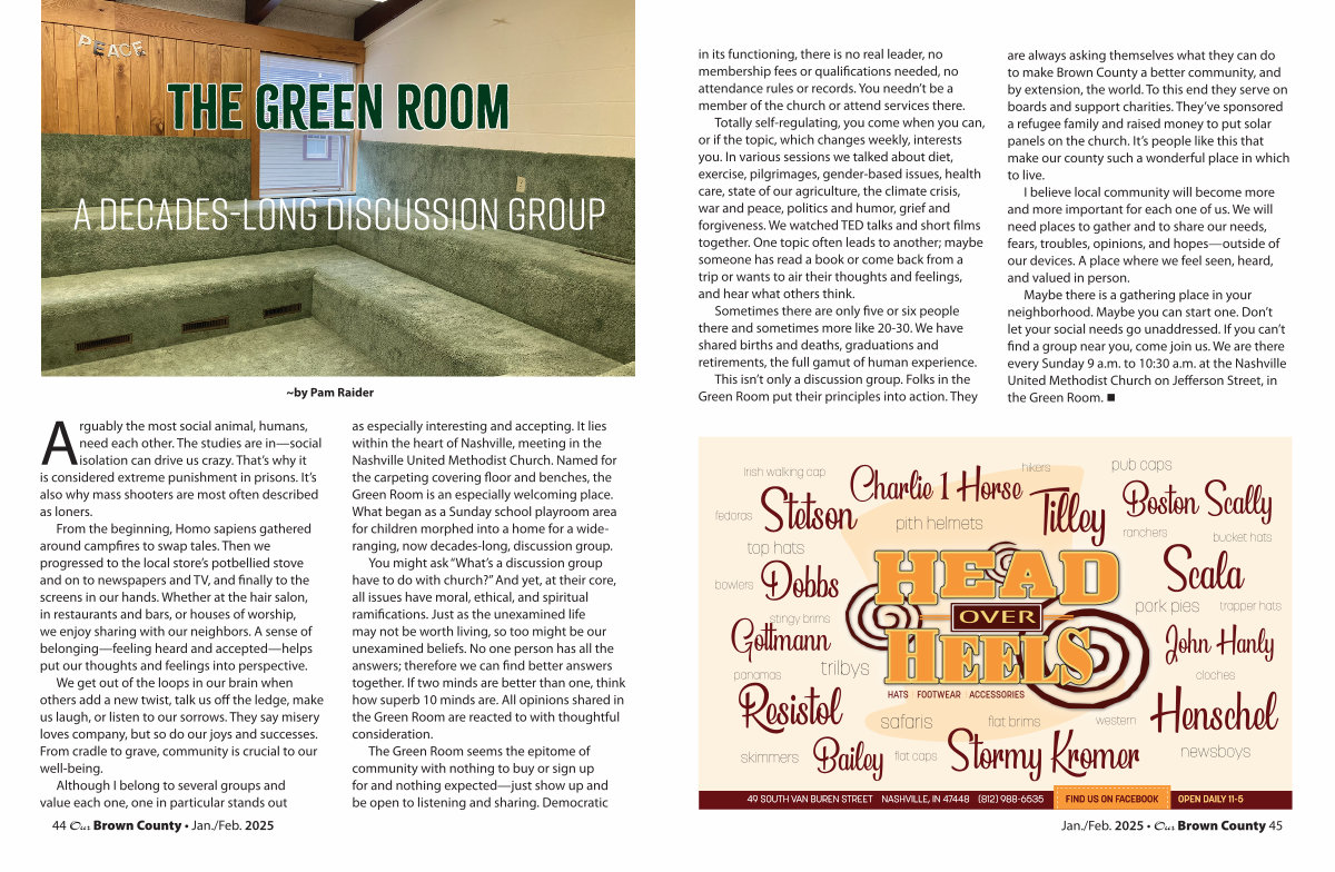 are always asking themselves what they can do to make Brown County a better community, and by extension, the world. To this end they serve on boards and support charities. They’ ve sponsored a refugee family and raised money to put solar panels on the church. It’ s people like this that make our county such a wonderful place in which to live.