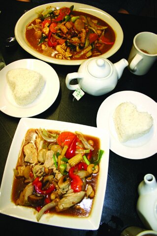There’s Pad Gra Prow, Thai spicy basil with stir fried meat in a homemade spicy sauce with green beans, onions and bell peppers; Eggplant Thailand with eggplant stir fried with veggies and the special Thai sauce; and sweet and sour sauté with pineapple and mixed vegetables.