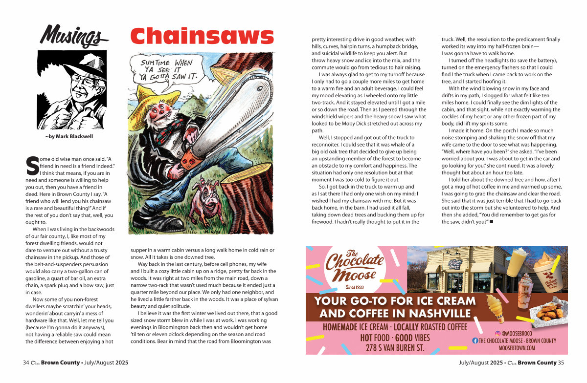 I told her about the downed tree and how, after I got a mug of hot coffee in me and warmed up some, I was going to grab the chainsaw and clear the road. She said that it was just terrible that I had to go back out into the storm but she volunteered to help. And then she added,“ You did remember to get gas for the saw, didn’ t you?” •