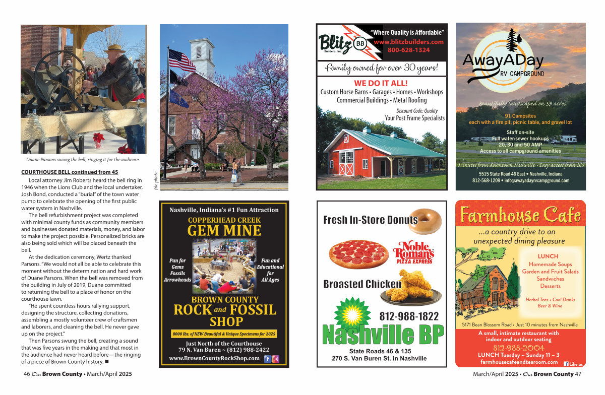 Then Parsons swung the bell, creating a sound that was five years in the making and that most in the audience had never heard before— the ringing of a piece of Brown County history. •