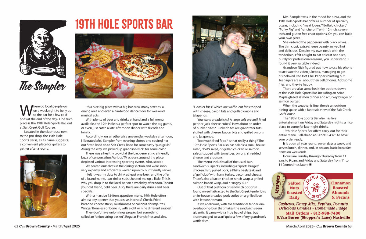 Mrs. Sampler was in the mood for pizza, and the 19th Hole Sports Bar offers a number of specialty pizzas, including“ meat lovers,”“ Buffalo chicken,”“ Porky Pig” and“ rancheroni” with 12-inch, seveninch and gluten free crust options. Or, you can build your own pizza.