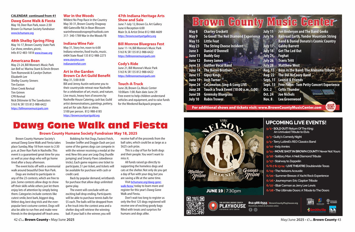 Brown County Humane Society’ s annual Dawg Gone Walk and Fiesta takes place Sunday, May 18 from noon to 2:30 p. m. at Deer Run Park in Nashville. This event is a guaranteed great time for you as well as your dogs who will go home tired after a busy afternoon.