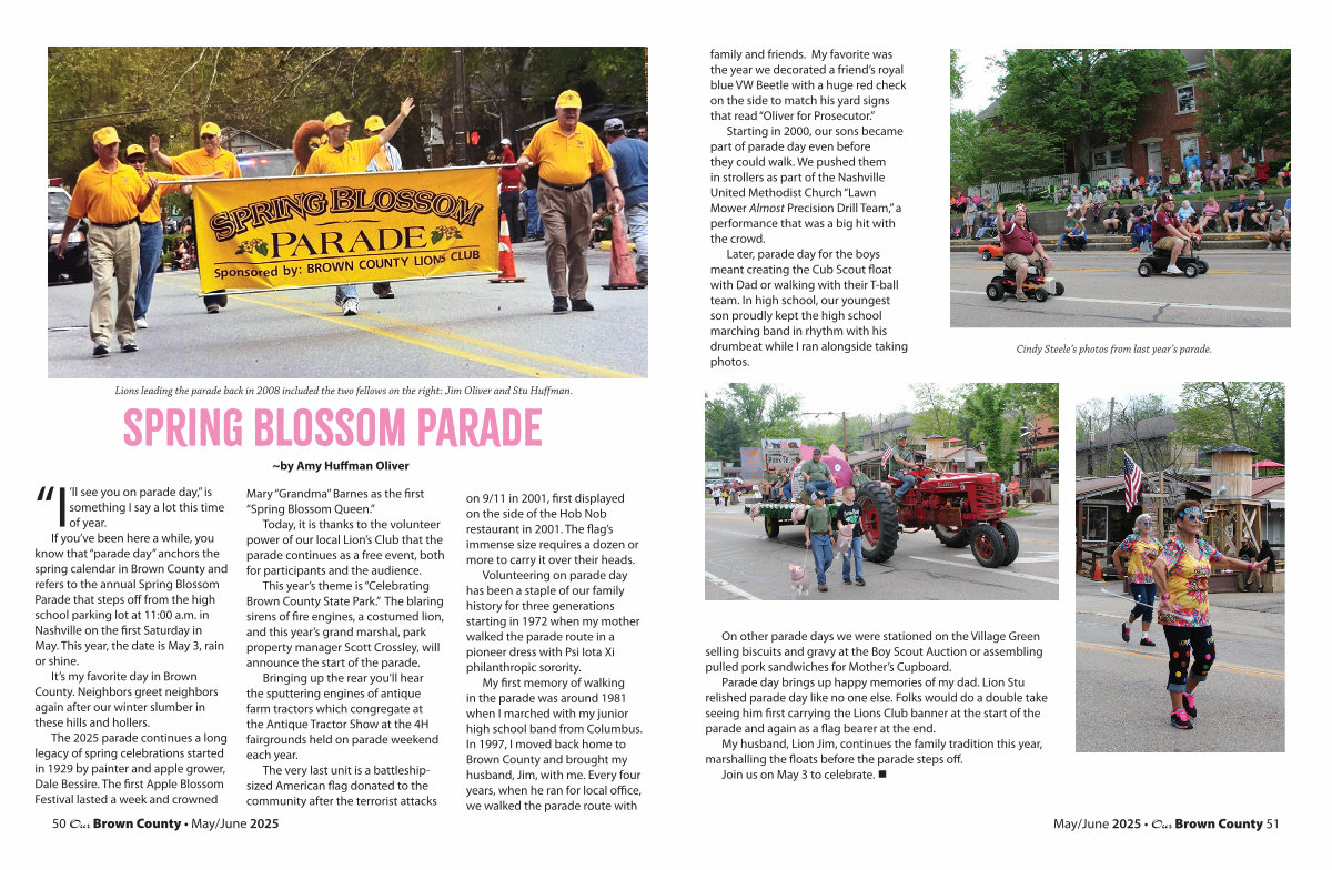 If you’ ve been here a while, you know that“ parade day” anchors the spring calendar in Brown County and refers to the annual Spring Blossom Parade that steps off from the high school parking lot at 11:00 a. m. in Nashville on the first Saturday in May. This year, the date is May 3, rain or shine.