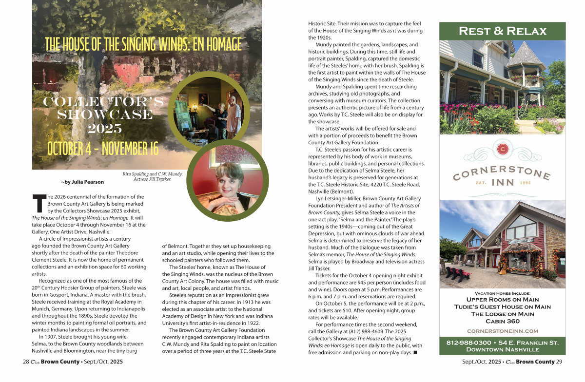 The 2026 centennial of the formation of the Brown County Art Gallery is being marked by the Collectors Showcase 2025 exhibit, The House of the Singing Winds: en Homage. It will take place October 4 through November 16 at the Gallery, One Artist Drive, Nashville.