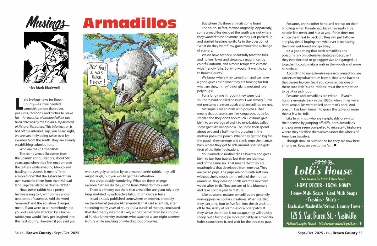 Late braking news for Brown County— as if we needed something more than deer, possums, raccoons, and turtles to brake for— An Invasion of armored aliens has been detected by the Indiana Department of Natural Resources. This information is hot off the internet. Yup, you heard right, we are stealthily being taken over by invaders from the south. They are already establishing colonies here. Who are they? Armadillos! The name armadillo comes from the Spanish conquistadors, about 500 years ago, when they first encountered the critters while invading Mexico and battling the Aztecs. It means“ little armored one.” But the Aztecs had their own name for them from their Nahuatl language translated as“ turtle-rabbit.” Now, turtle-rabbit has a pretty harmless ring to it, with some serious overtones of cuteness. Add the word“ armored” and the equation changes. I mean, if you were to tell somebody that you got savagely attacked by a turtlerabbit, you would likely get laughed into the next county. However, if you said you