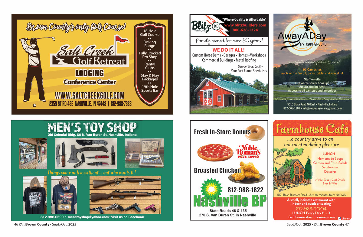 812.988.6590 • menstoyshop @ yahoo. com • Visit us on Facebook 46 Our Brown County • Sept./ Oct. 2025