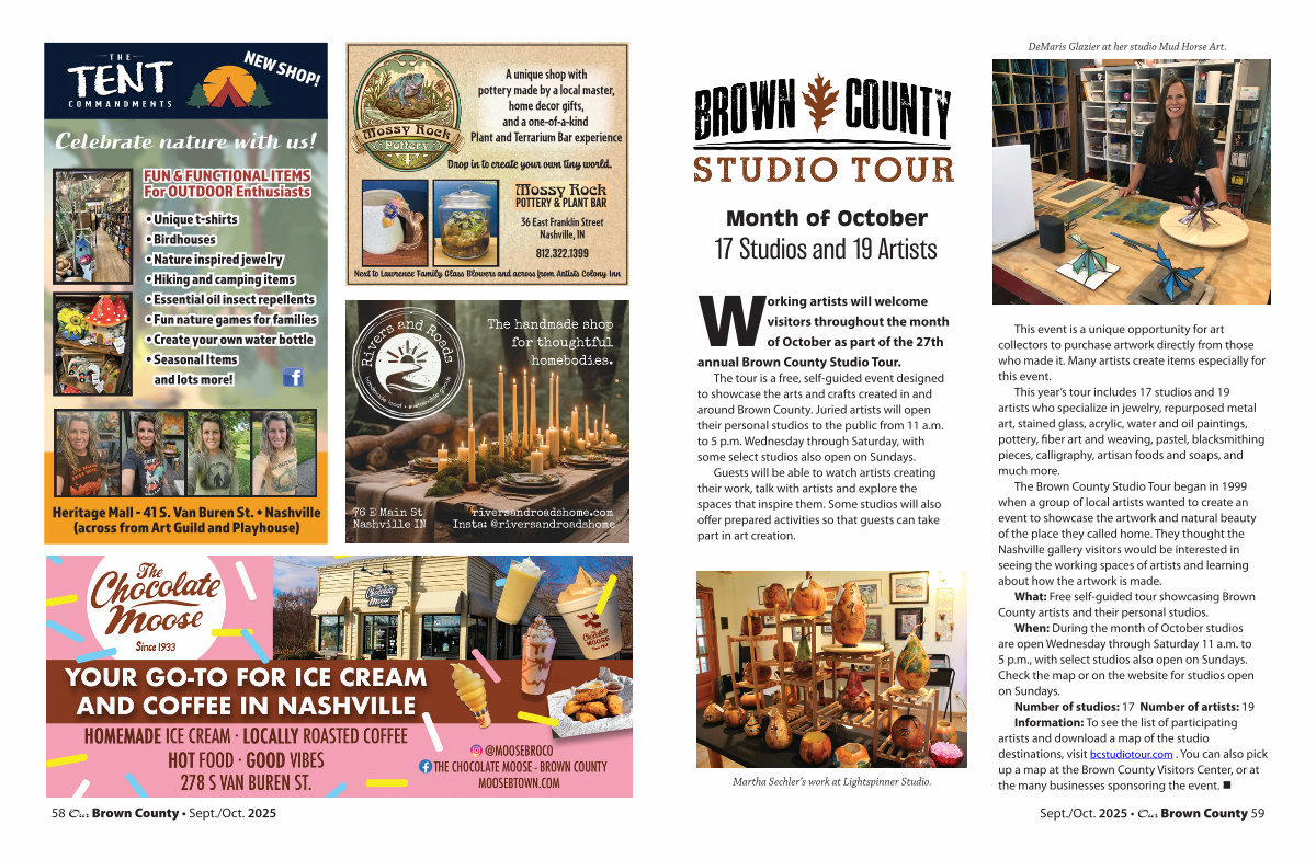 When: During the month of October studios are open Wednesday through Saturday 11 a. m. to 5 p. m., with select studios also open on Sundays. Check the map or on the website for studios open on Sundays. Number of studios: 17 Number of artists: 19 Information: To see the list of participating artists and download a map of the studio destinations, visit bcstudiotour. com. You can also pick up a map at the Brown County Visitors Center, or at the many businesses sponsoring the event. •