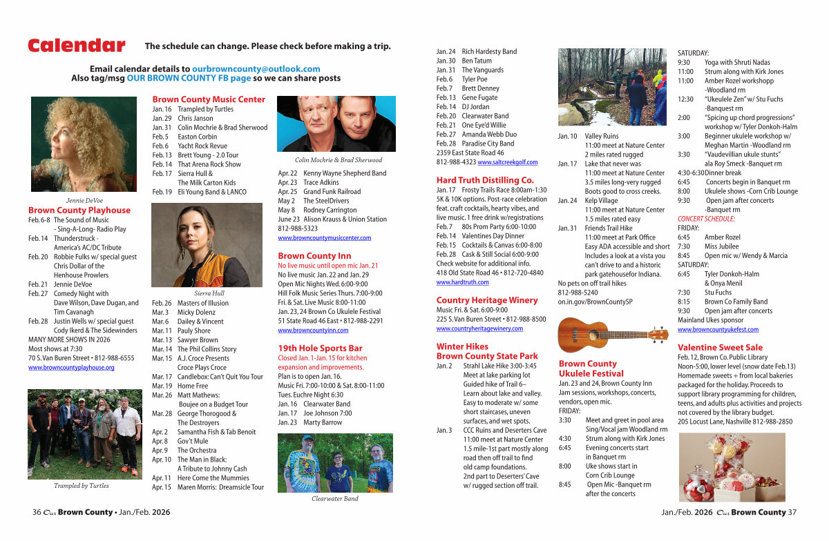 Jan. 23 and 24, Brown County Inn Jam sessions, workshops, concerts, vendors, open mic. FRIDAY: 3:30 Meet and greet in pool area
