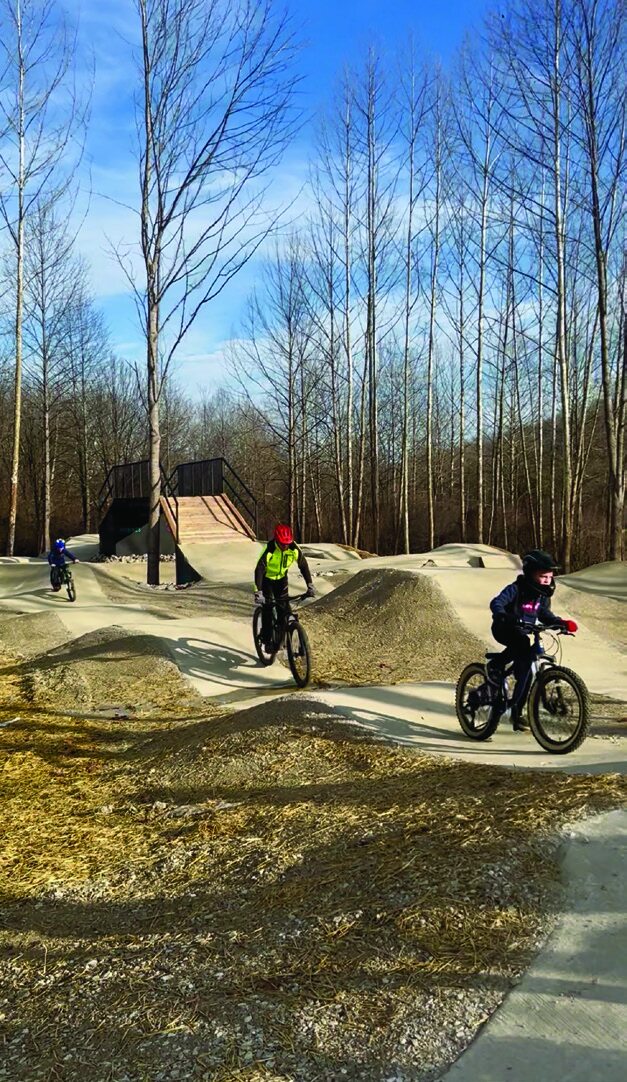 Despite cold temperatures, cyclists of all ages and skill levels are already using the Brown County Pump Track to drop off ledges, pump over smooth rollers, and carve through banked turns that tip their bodies almost horizontal.
