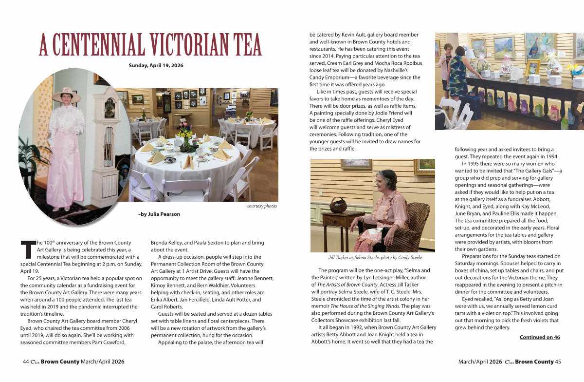 It all began in 1992, when Brown County Art Gallery artists Betty Abbott and Joan Knight held a tea in Abbott’ s home. It went so well that they had a tea the following year and asked invitees to bring a guest. They repeated the event again in 1994. In 1995 there were so many women who wanted to be invited that“ The Gallery Gals”— a group who did prep and serving for gallery openings and seasonal gatherings— were asked if they would like to help put on a tea at the gallery itself as a fundraiser. Abbott, Knight, and Eyed, along with Kay McLeod, June Bryan, and Pauline Ellis made it happen. The tea committee prepared all the food, set-up, and decorated in the early years. Floral arrangements for the tea tables and gallery were provided by artists, with blooms from their own gardens.