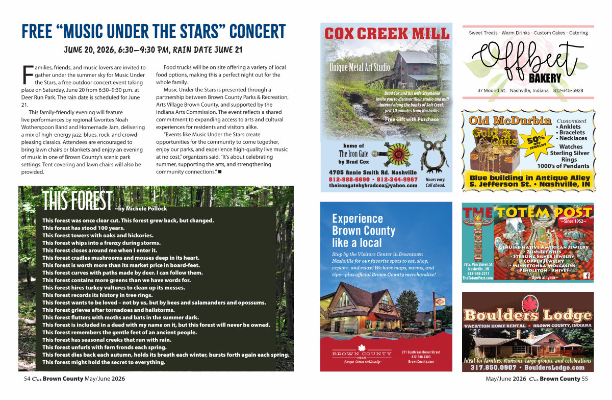 Music Under the Stars is presented through a partnership between Brown County Parks & Recreation, Arts Village Brown County, and supported by the Indiana Arts Commission. The event reflects a shared commitment to expanding access to arts and cultural experiences for residents and visitors alike.